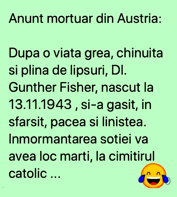 Dacă e joi, atunci este momentul să ne delectăm cu un nou banc haios. De data aceasta, este vorba despre un inedit anunț mortuar, venit din Austria. Iată bancul!