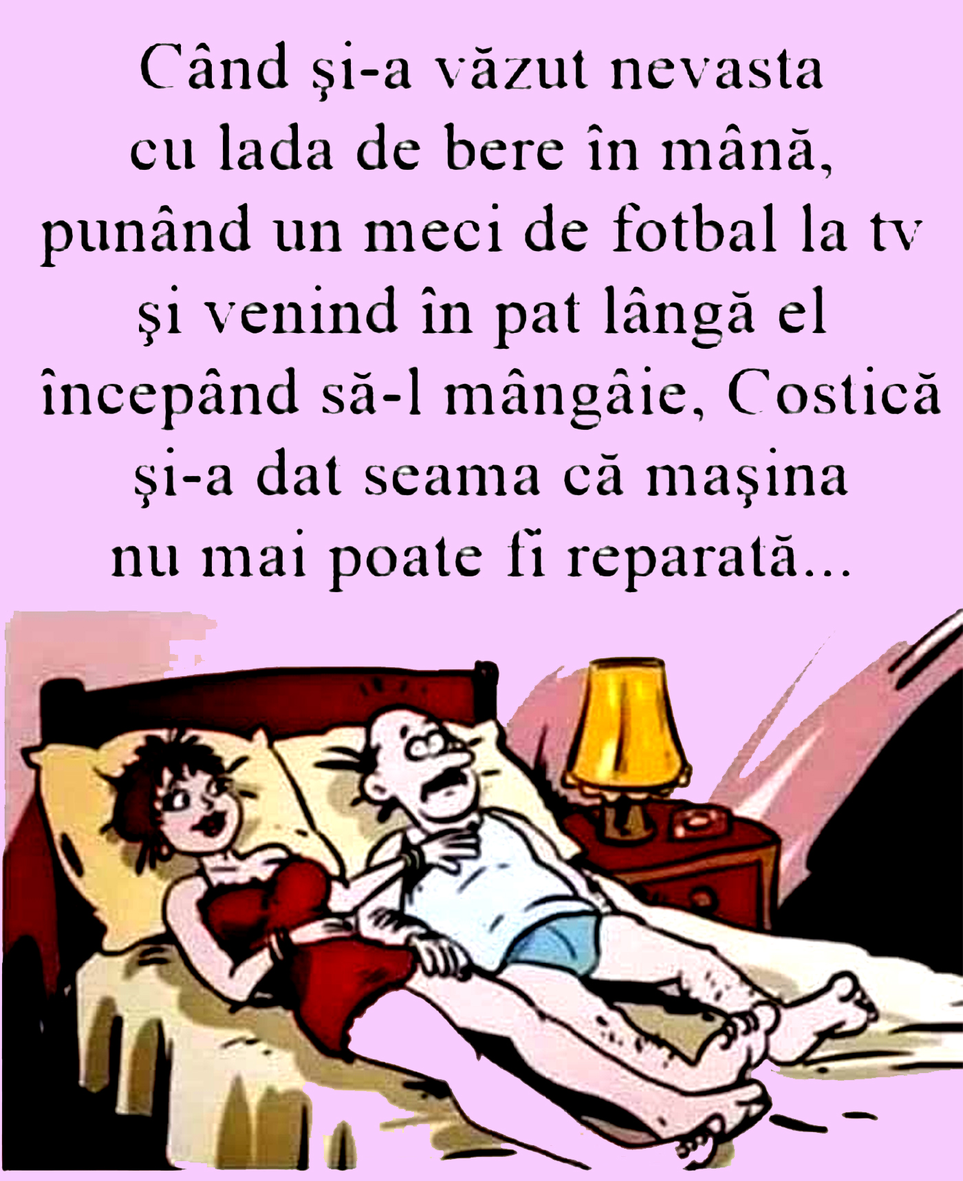 Când și-a văzut nevasta cu lada de bere în mână, punând un meci de fotbal la TV și venind în pat lângă el, începând să-l mângâie, Costică și-a dat seama că mașina nu mai poate fi reparată…