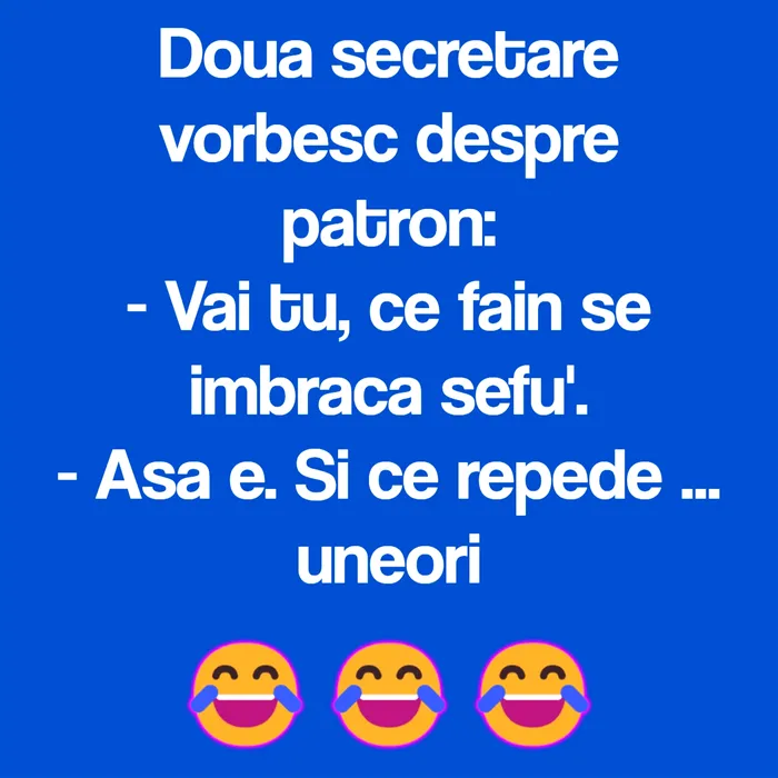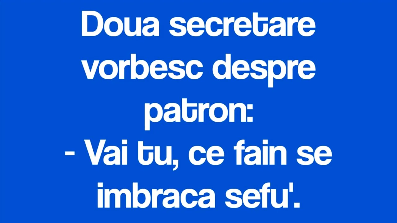 Săptămâna nu poate continua fără o porție copioasă de râs. Pentru ziua de azi, 23 mai, am pregătit bancul care cu siguranță o să-ți aducă zâmbetul pe buze. Două secretare vorbesc despre patron.