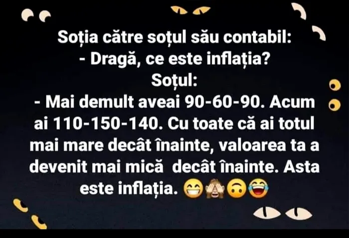 Mai demult aveai 90-60-90. Acum ai 110-150-140. Cu toate că ai totul mai mare decât înainte, valoarea ta a devenit mai mică decât înainte. Asta este inflația.