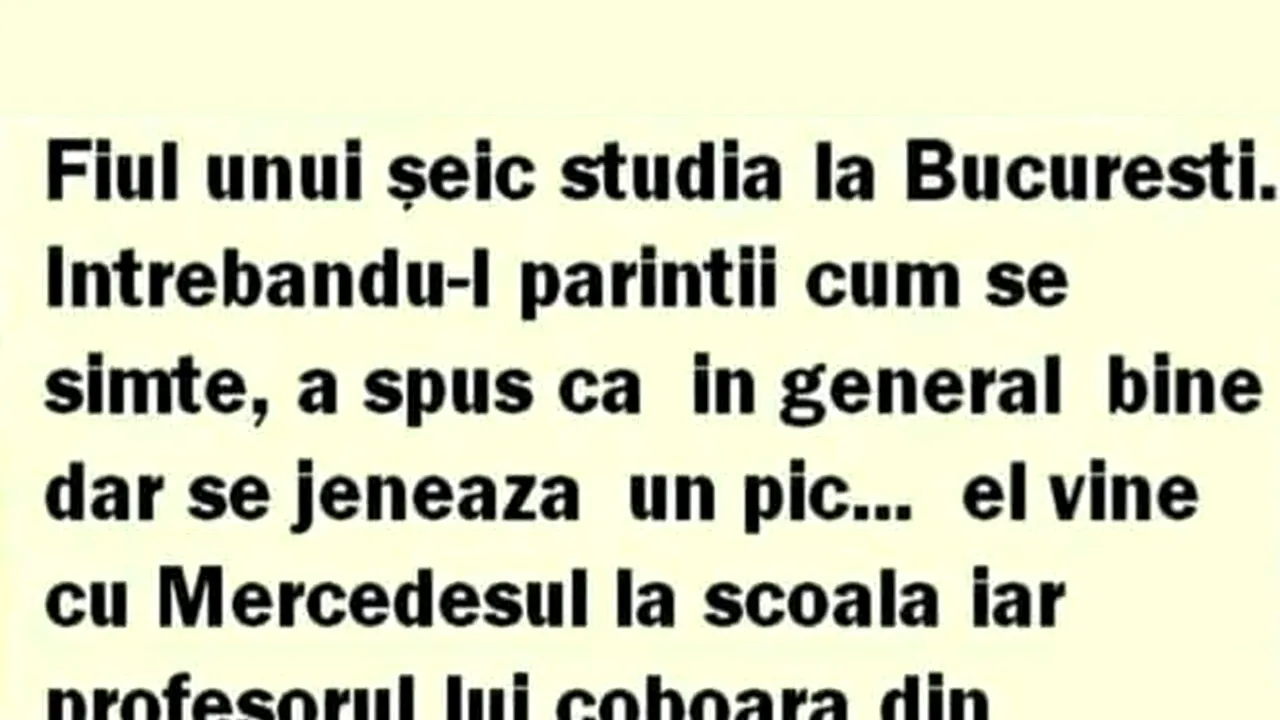 GÂNDUL îți oferă azi, joi, 13 iunie, un banc amuzant care te va însenina. Ziua trece mai ușor când zâmbești, nu-i așa?! Banc: fiul unui șeic era student la București.