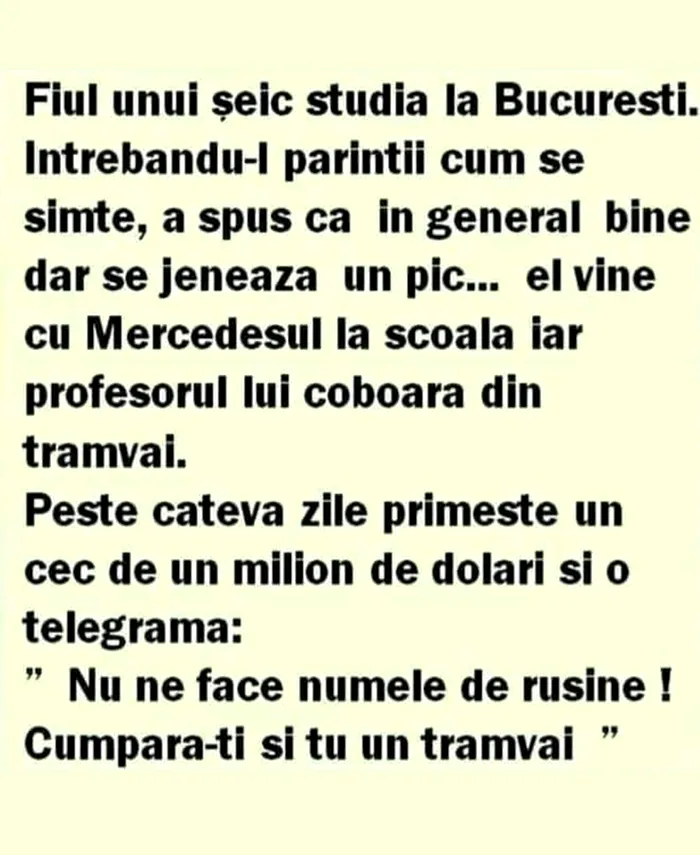 Întrebându-l părinţii cum se simte, le-a răspuns că, în general, bine, dar se jenează un pic când el vine cu Mercedesul 500 la școală, iar profesorul lui coboară din tramvai.