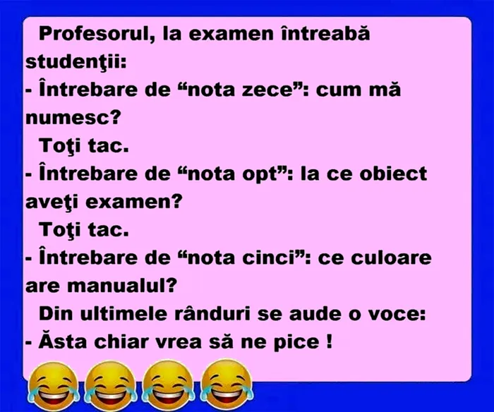 – Întrebare de notă opt: la ce materie aveți examenul?