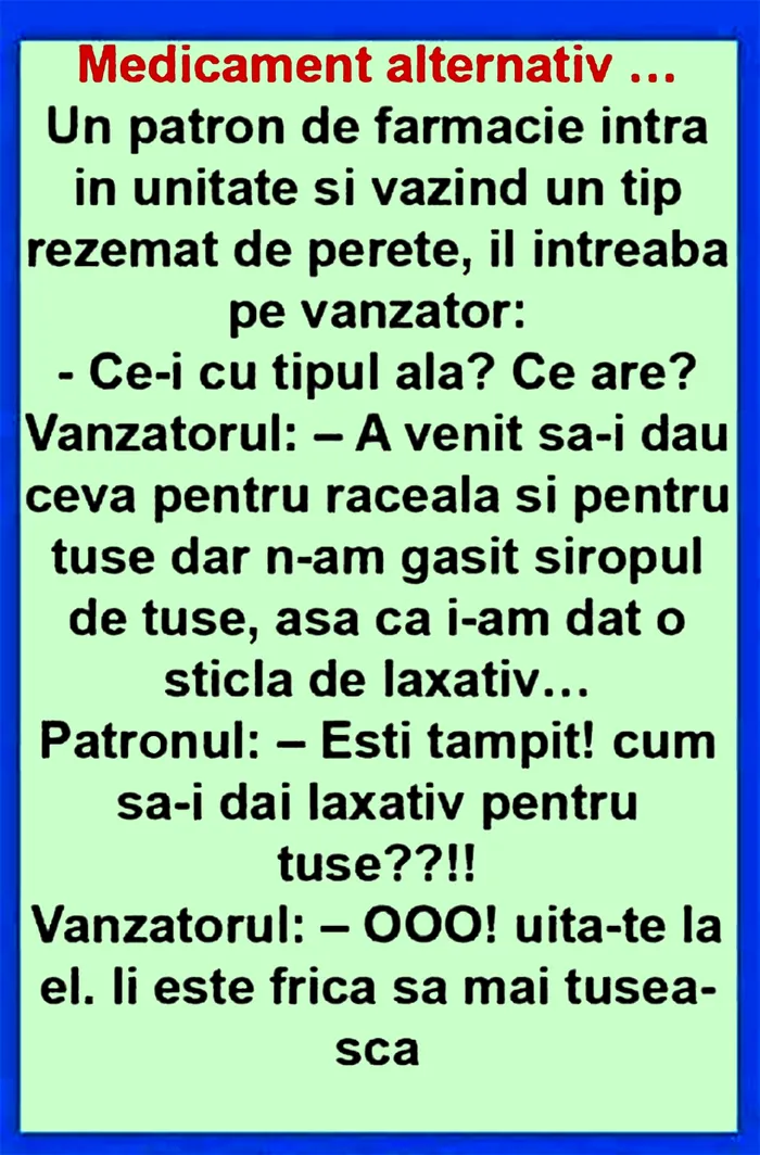 Vânzătorul: A venit să-i dau ceva pentru răceală și pentru tuse, dar n-am găsit siropul de tuse, așa că i-am dat o sticlă de laxativ.