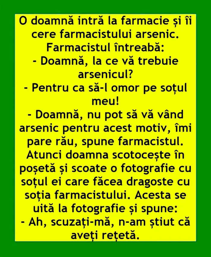 – Doamnă, nu pot să vă vând arsenic pentru acest motiv, îmi pare rău.