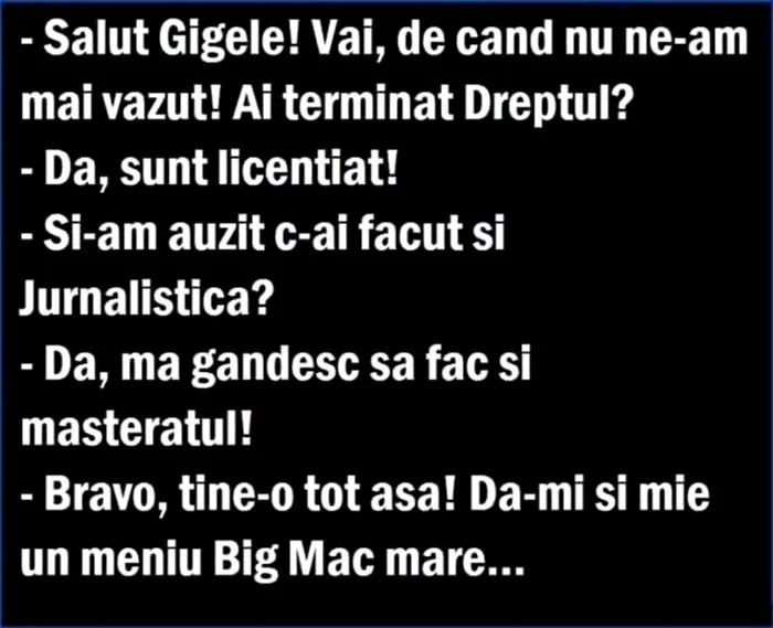 Bancul de joi | „Salut, Gigele! Ai terminat Dreptul?”