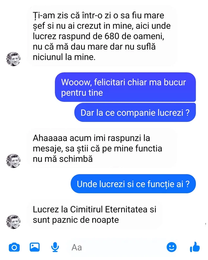 -Ți-am zis că într-o zi o să fiu mare șef și nu ai crezut în mine, aici unde lucrez răspund de 680 de oameni, nu că mă dau mare, dar nu suflă niciunul la mine.