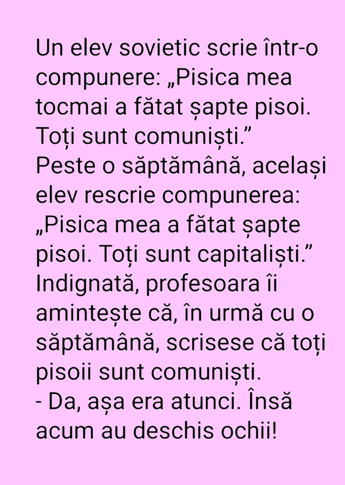 Peste o săptămână, același elev rescrie compunerea: „Pisica mea a fătat șapte pisoi. Toți sunt capitaliști”.