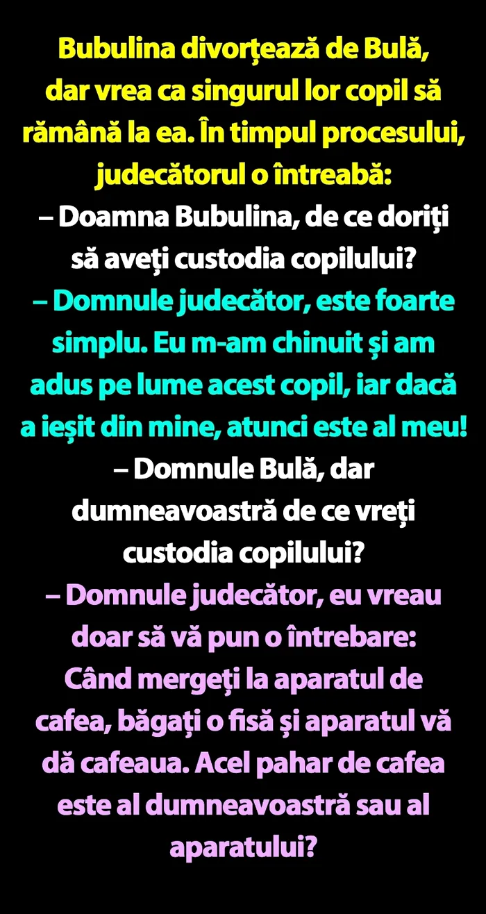 – Domnule Bulă, dar dumneavoastră de ce vreți custodia copilului?