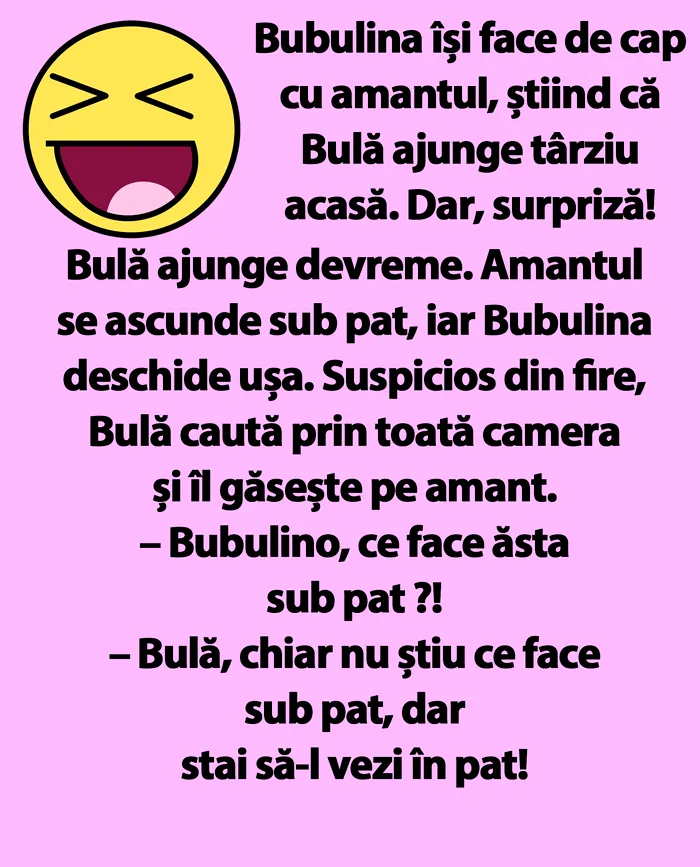 – Bulă, chiar nu știu ce face sub pat, dar stai să-l vezi în pat!