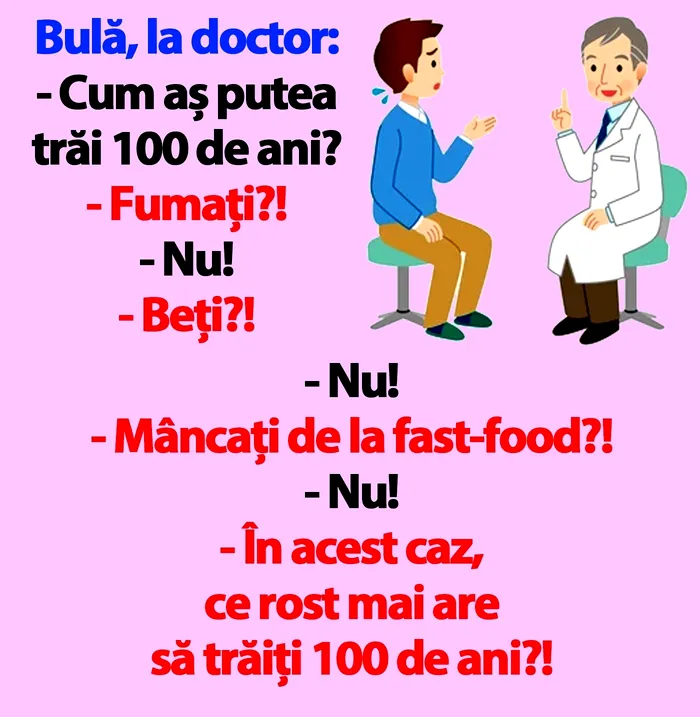 GÂNDUL.RO vă propune pentru azi un banc care să vă binedispună. Să continuăm ziua cu un zâmbet! Bulă, la doctor: „Cum aș putea trăi 100 de ani?”.
