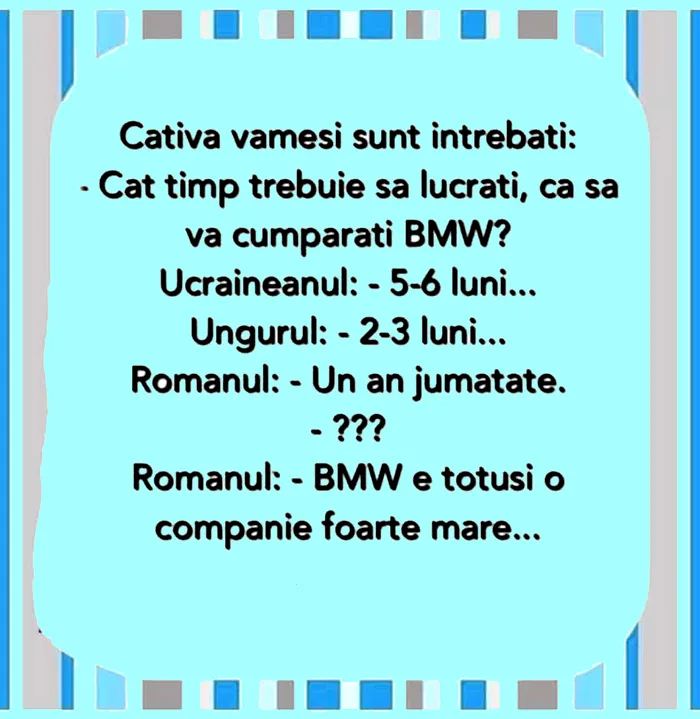 Bancul de luni | „Cât timp trebuie să lucrați ca să vă cumpărați BMW?”