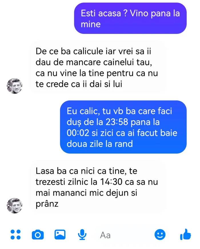 – Eu calic? Tu vorbești, care faci duș de la 23.58 până la 00.02 și zici că ai făcut baie două zile la rând?
