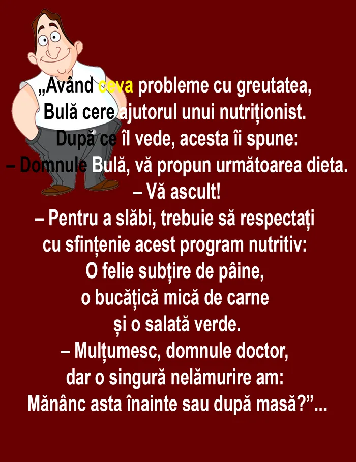 Știi bancul cu dieta lui Bulă? Sau știai că Bulă urmează o dietă? În orice situație, citește bancul de luni și află despre ce este vorba!