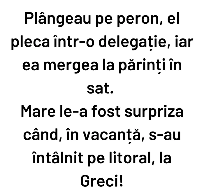 „Plângeau pe peron, el pleca într-o delegație, iar ea mergea la părinți în sat. Mare le-a fost surpriza când, în vacanță, s-au întâlnit pe litoral, la greci”.