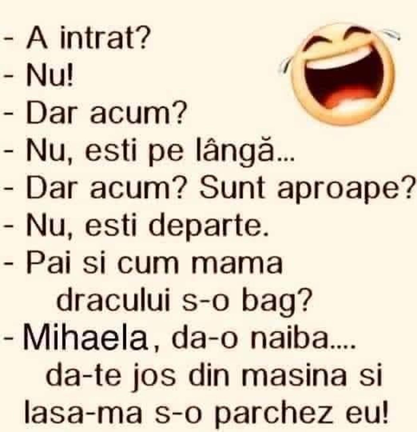 – Mihaela, dă-o naiba… dă-te jos din mașină și lasă-mă s-o parchez eu!