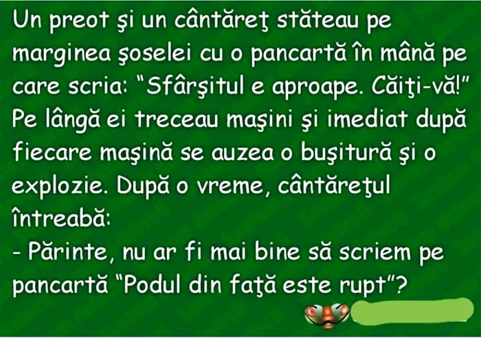 Un preot şi un cântăreț stăteau pe marginea şoselei cu o pancartă în mână pe care scria: “Sfârşitul e aproape. Căiţi-vă!”