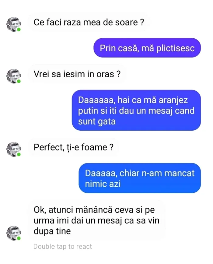 – Daaaa, hai că mă aranjez puțin și îți dau mesaj când sunt gata.