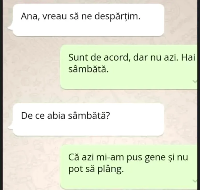 Dacă e marți, vă delectăm cu un nou banc spumos. În acest banc este vorba despre o discuție în cuplu. Băiatul îi cere fetei despărțirea. Dialogul este unul savuros.