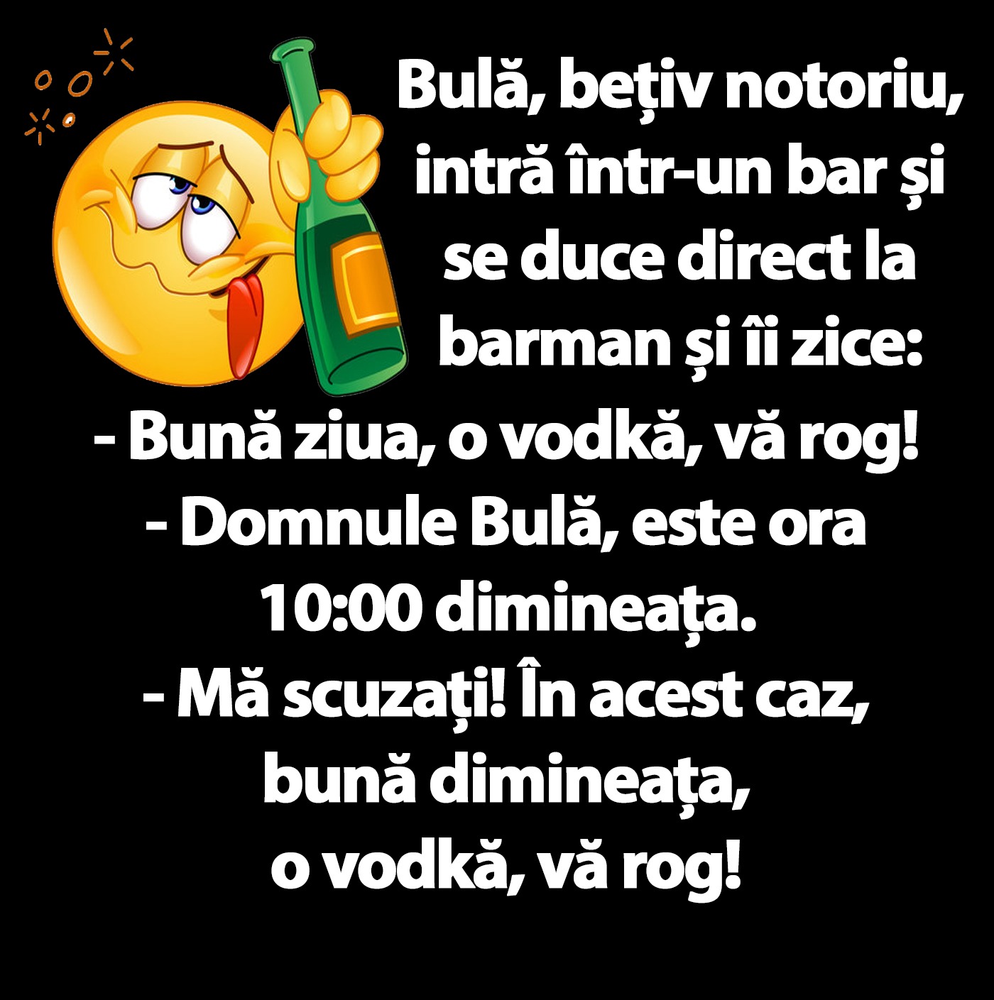 Bancul de marți | Bulă, bețiv notoriu, intră într-un bar: „Bună ziua, o vodkă, vă rog!”