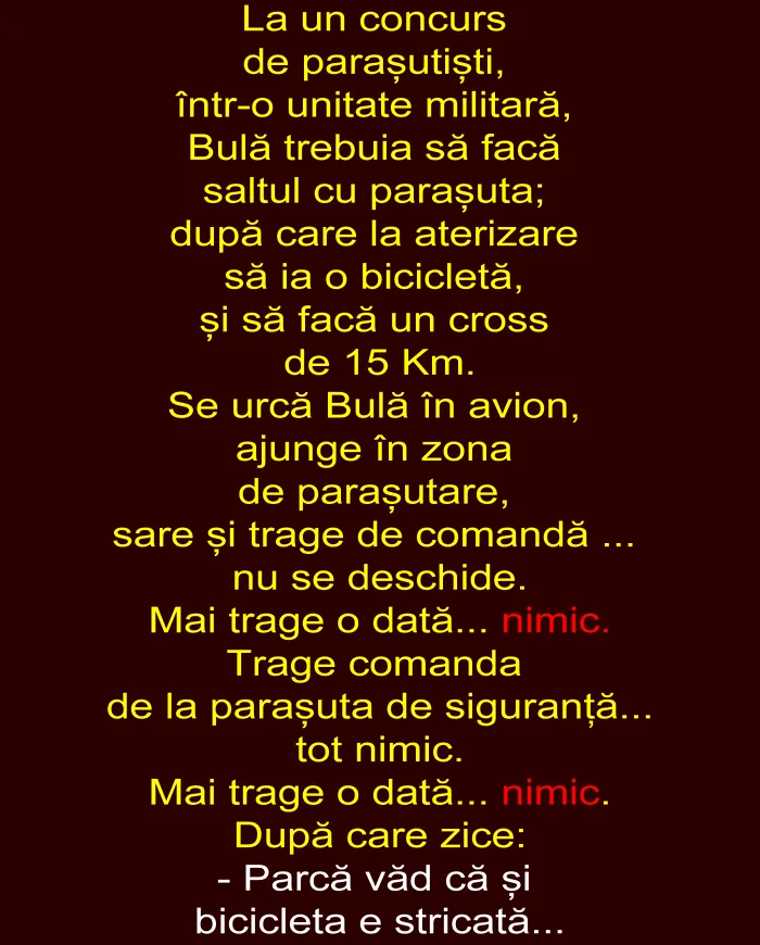 Se urcă Bulă în avion, ajunge în zona de parașutare, sare și trage de comandă … nu se deschide.