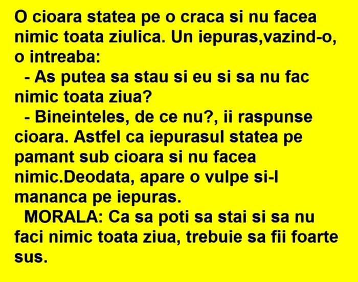 – Bineînțeles, de ce nu? îi răspunse cioara. Astfel că iepurașul stătea pe pământ sub cioară și nu făcea nimic. Deodată, apare o vulpe și-l mănâncă pe iepuraș.