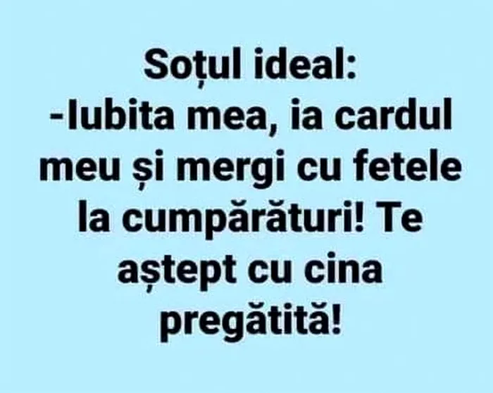 – Iubita mea, ia cardul meu și mergi cu fetele la cumpărături! Te aștept cu cina pregătită!