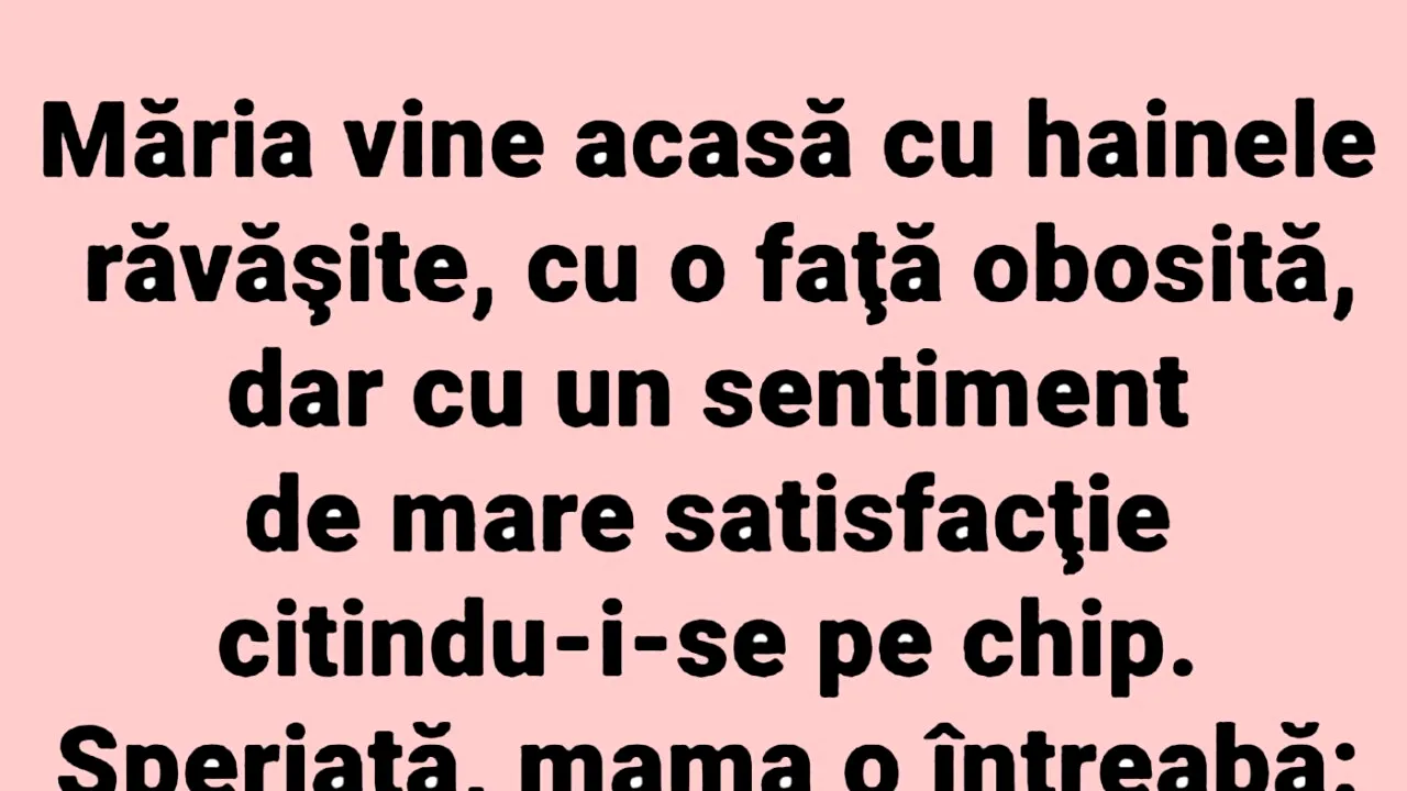 Măria vine acasă cu hainele răvășite, dar cu un sentiment de mare satisfacție citindu-i-se pe chip. Speriată, mama o întreabă: