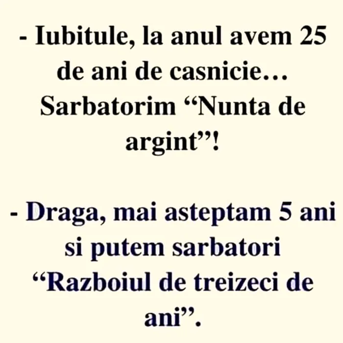 – Dragă, mai așteptăm 5 ani și putem sărbători „Războiul de treizeci de ani”.