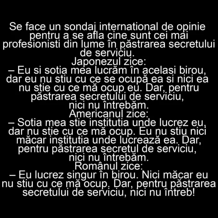 Gândul îți oferă bancul de marți, sub forma unui sondaj internațional de opinie, realizat pentru a se afla cine sunt cei mai profesioniști din lume în păstrarea secretului de serviciu.