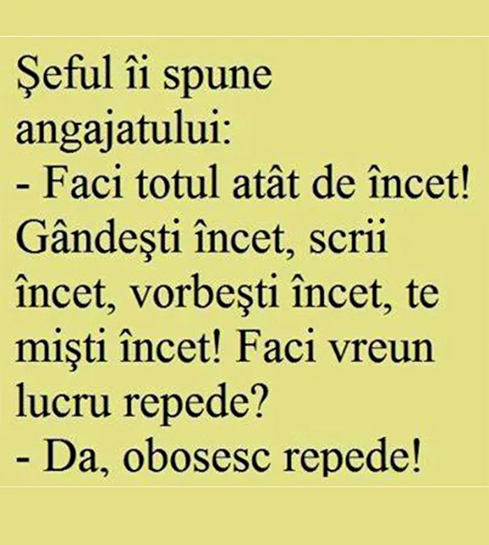 Săptămâna de lucru devine întotdeauna mai ușoară când ne destindem cu momente amuzante. Redacția „Gândul” vă oferă un banc de împărtășit cu cei dragi: „Șeful își mustră angajatul: «Faci totul prea încet!»”.