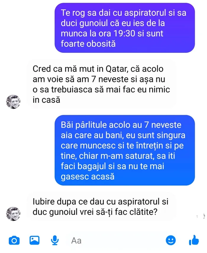 – Te rog să dai cu aspiratorul și să duci gunoiul că eu ies de la muncă la ora 19:30 și sunt foarte obosită.