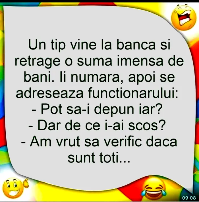 Săptămâna de lucru devine întotdeauna mai ușoară dacă ne destindem cu momente amuzante. Redacția „Gândul” vă oferă un banc de împărtășit cu cei dragi: „Un tip se duce la bancă și retrage o sumă imensă de bani”.