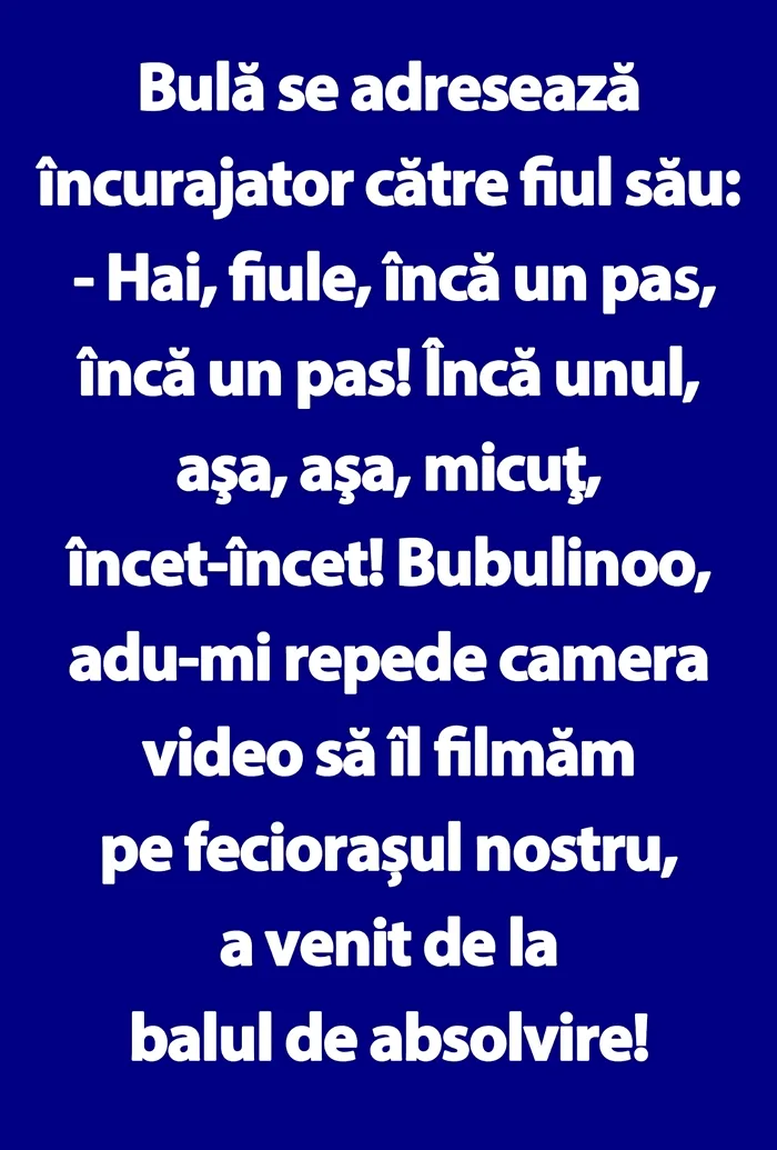 – Hai, fiule, încă un pas, încă un pas! Încă unul, aşa, aşa, micuţ, încet-încet! Bubulinoooo, adu-mi repede camera video să îl filmăm pe feciorașul nostru, a venit de la balul de absolvire!