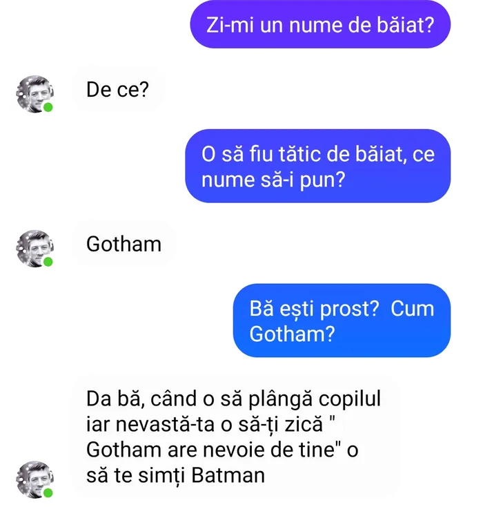 – Da bă, când o să plângă copilul și nevastă-ta o să zică ”Gottham” are nevoie de tine, o să te simți ca Batman.