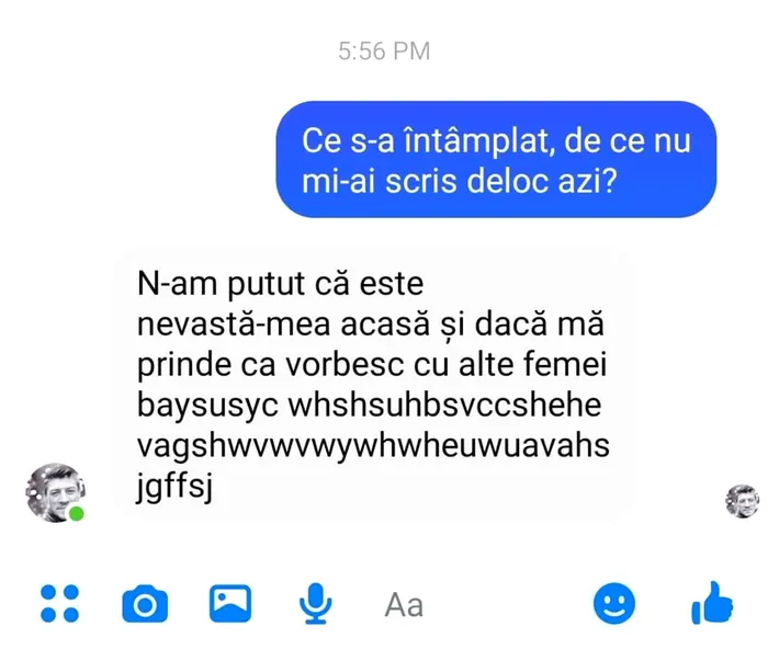 – N-am putut că este nevastă-mea acasă și dacă mă prinde că vorbesc cu alte femei baysusyc whshsuhbsvccshehevagshwvwvwywhwheuwuavahsjgffsj.
