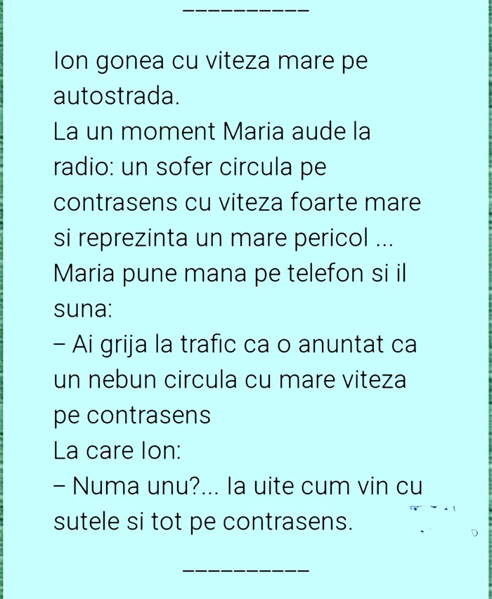 – Ai grijă la trafic că au anunțat că un nebun circulă cu mare viteză pe contrasens.