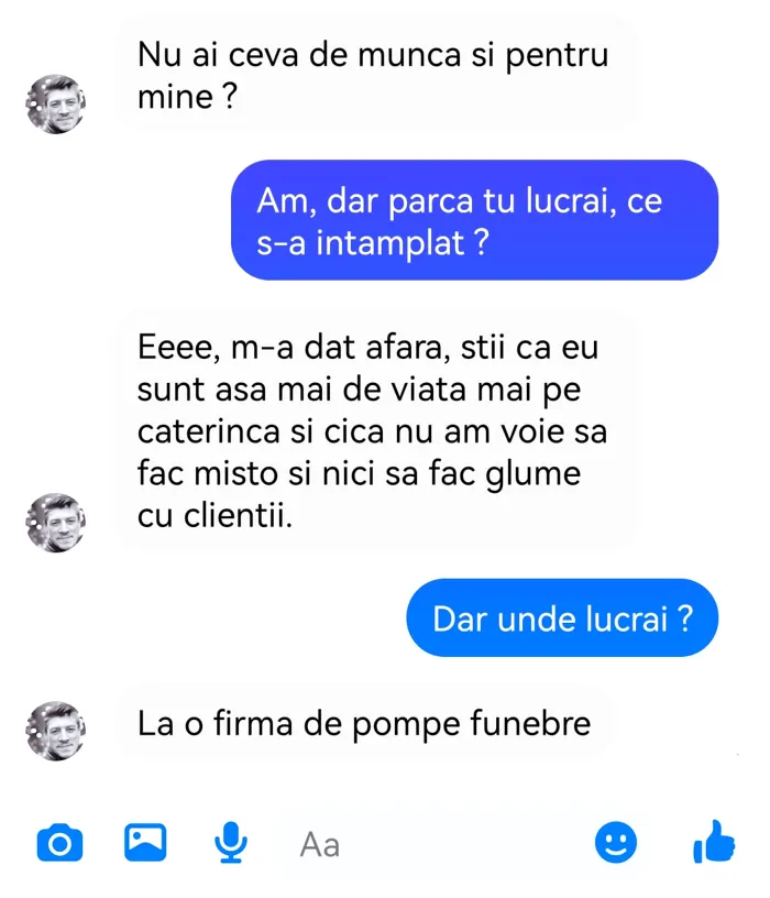 – Eeee, m-a dat afară, știi că eu sunt așa mai de viață mai pe caterincă și cică nu am voie să fac mișto și nici să fac glume cu clienții.