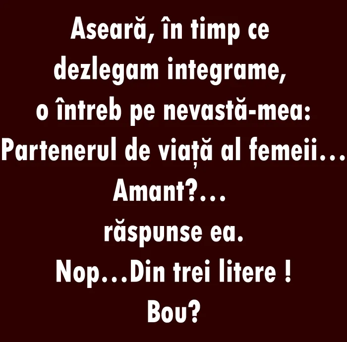 Aseară, în timp ce dezlegam integrame, o întreb pe nevastă-mea: