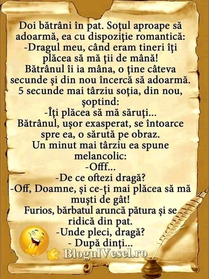 -Dragul meu, când eram tineri, îți plăcea să mă ții de mână! Bătrânul îi ia mâna, o ţine câteva secunde și din nou încearcă să adoarmă. 5 secunde mai târziu soţia, din nou, şoptind: