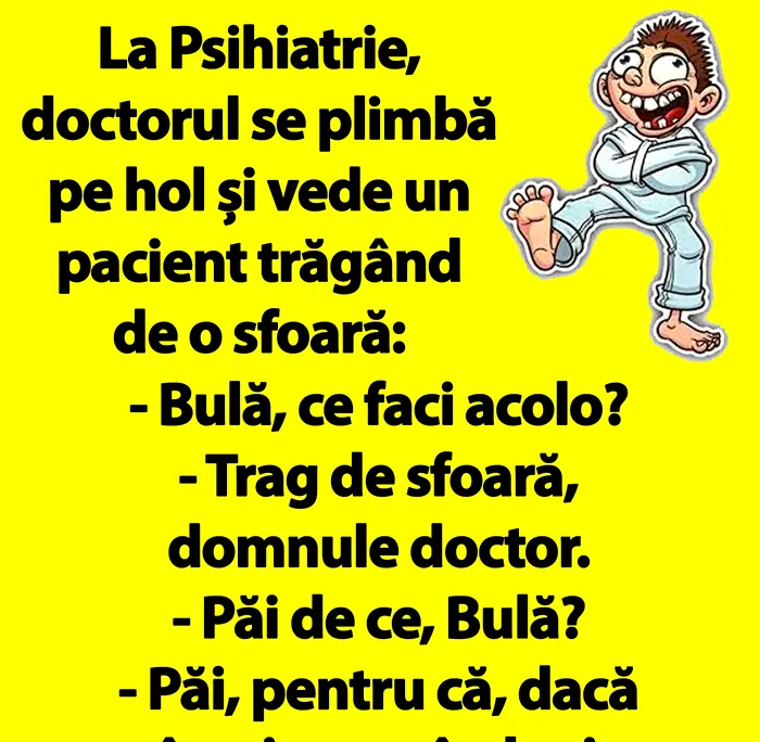 „La Psihiatrie, doctorul se plimbă pe hol și vede un pacient trăgând de o sfoară: