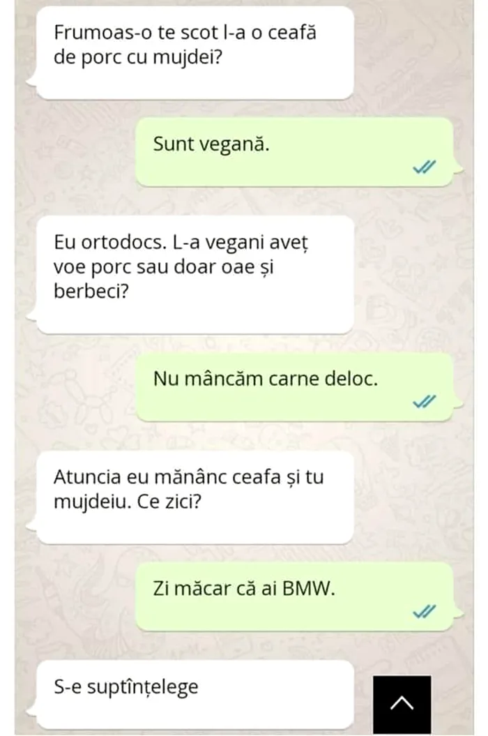 Bancul de sâmbătă | Agramatul, vegana și ceafa de porc. Un cocktail cu adevărat exploziv, care „degenerează” în bancul de sâmbătă.