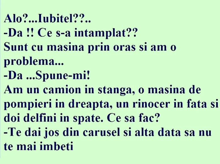 – Am un camion în stânga, o mașină de pompieri în dreapta, un rinocer în față și doi delfini în spate. Ce să fac?