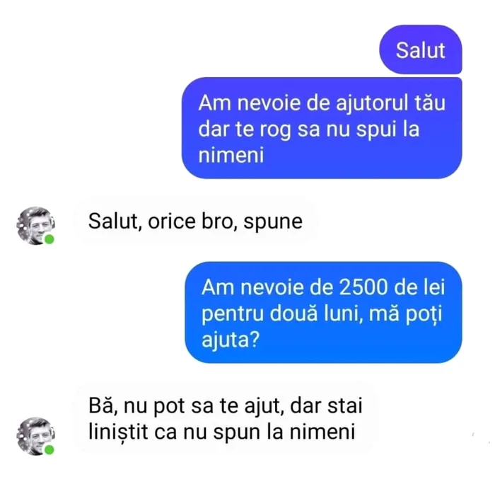 – Bă, nu pot să te ajut, dar stai liniștit, nu spun la nimeni!