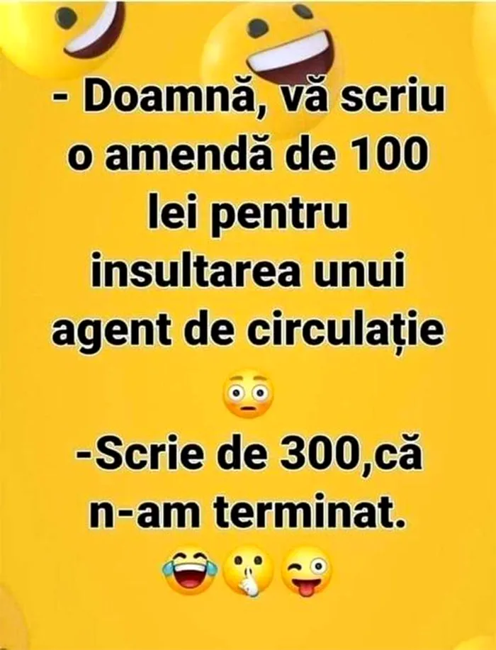 – Doamnă, vă scriu o amendă de 100 de lei pentru insultarea unui agent de circulație!