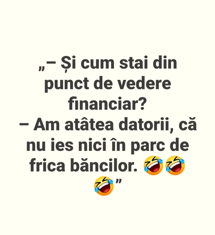 – Am atâtea datorii, că nu ies nici în parc de frica băncilor.”