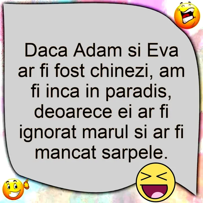 Bancul de sâmbătă. Este dimineață, un moment perfect în care să vă începeți ziua cu zâmbetul pe buze! Ce s-ar fi întâmplat dacă Adam și Eva ar fi fost chinezi? Răspunsul va stârni amuzamentul. Spor la râs!