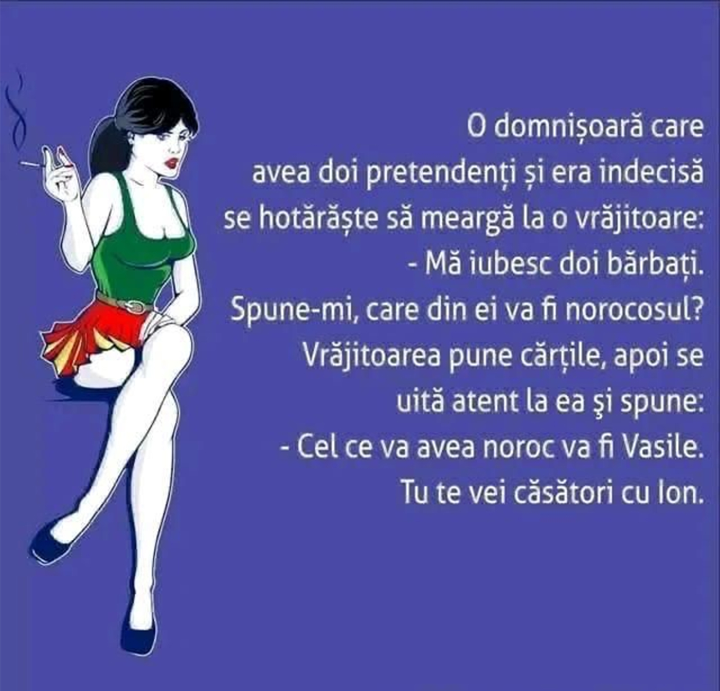 –Mă iubesc doi bărbați. Spune-mi, care din ei va fi norocosul?
