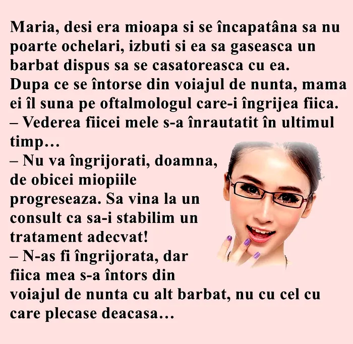 – Nu vă îngrijorați, doamnă, de obicei miopiile progresează. Să vină la un consult ca să-i stabilim un tratament adecvat!