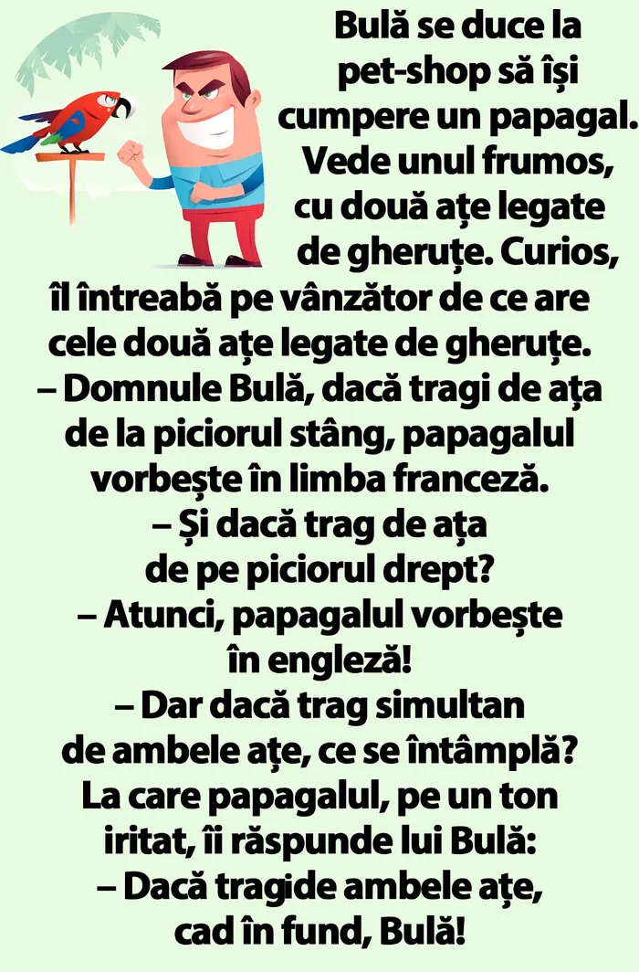 – Domnule Bulă, dacă tragi de ața de la piciorul stâng, papagalul vorbește în limba franceză.